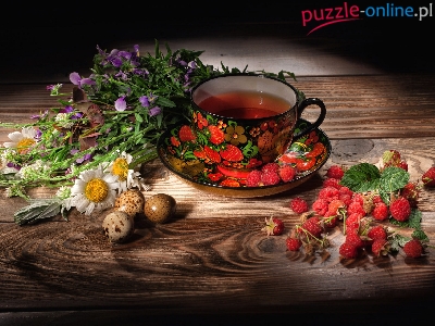 Herbata, Kwiaty, Jajeczka, Polne, Deski, Złocienie, Filiżanka, Bukiet, Bratki, Maliny