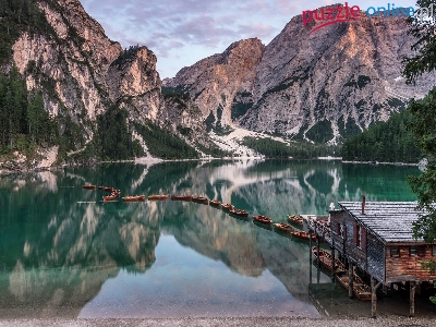 Region Trydent-Górna Adyga, Południowy Tyrol, Drzewa, Drewniany, Łódki, Góry Dolomity, Włochy, Jezioro Pragser Wildsee, Dom