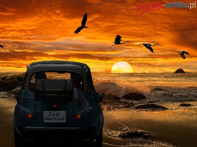 Zachód słońca, 2D, Nowożeńcy, Samochód, Ptaki, Morze, Plaża, Podróż poślubna
