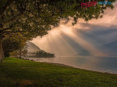 Góry, Włochy, Ogród Villa Melzi, Drzewa, Przebijające światło, Jezioro Como, Domy, Bellagio