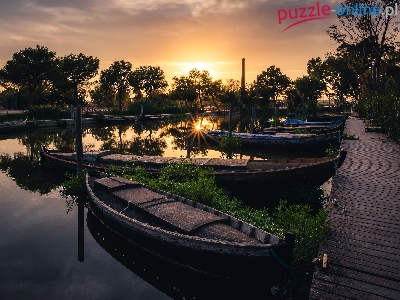 Łódki, Zachód słońca, Przystań, Pomost, Drzewa