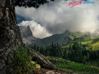 Chmury, Trawa, Góry, Drzewa, Kwiaty