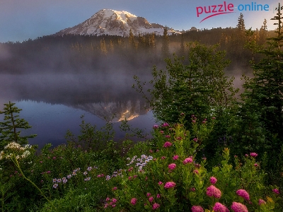 Góra, Jezioro Reflection Lake, Drzewa, Kwiaty, Stany Zjednoczone, Mgła, Park Narodowy Mount Rainier, Szczyt Mount Rainier, Stan Waszyngton