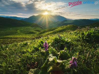 Góry, Rośliny, Promienie słońca, Kwiaty, Łąka, Wzgórza