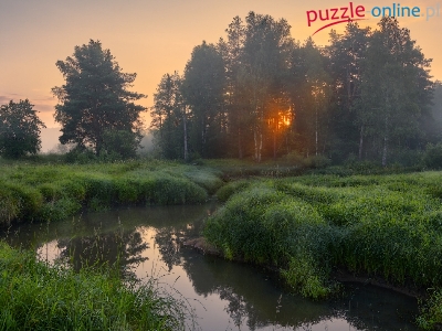 Drzewa, Gęsta, Świt, Rzeka, Trawa, Mgła