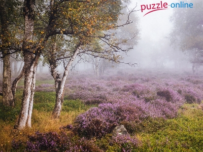 Wrzosowisko, Anglia, Park Narodowy Peak District, Drzewa, Mgła, Jesień, Brzozy, Stanton Moor