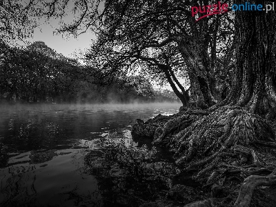 Poranek, Drzewo, Czarno-białe, Rzeka, Korzenie, Mgła