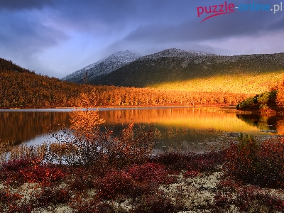 Jezioro Jack London, Góry, Odbicie, Kołyma, Rosja, Rośliny, Jesień, Drzewa, Obwód magadański