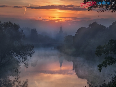 Drzewa, Rosja, Suzdal, Mgła, Wschód słońca, Rzeka Kamienka, Cerkiew, Obwód włodzimierski