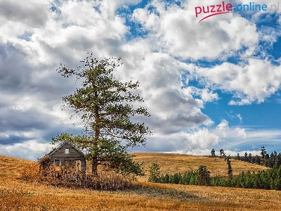 Zniszczony, Wzgórza, Pole, Drzewa, Dom