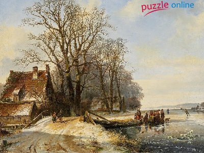 Staw, Frans Arnold Breuhaus de Groot, Ludzie, Obraz, Łyżwiarze, Domy, Wieś, Malarstwo, Zima, Drzewa