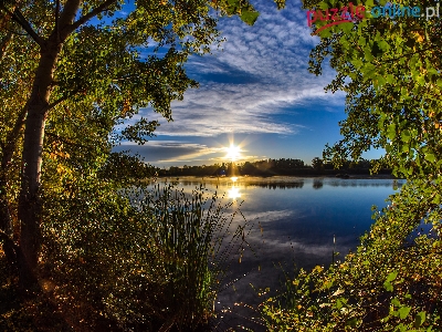 Drzewa, Chmury, Jezioro, Las, Promienie słońca