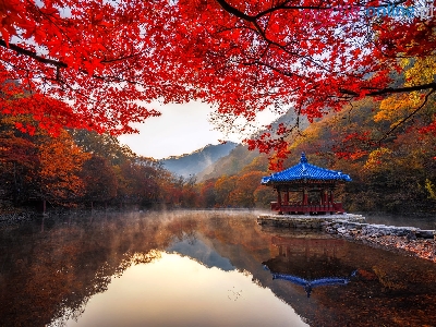 Drzewa, Jesień, Korea Południowa, Altana, Park Narodowy Naejangsan, Staw, Jeongeup