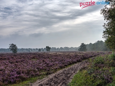 Pole, Droga, Chmury, Wrzosowisko, Drzewa, Mgla