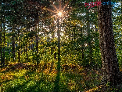 Drzewa, Drzewa, Promienie słońca, Las, Pień, Trawa