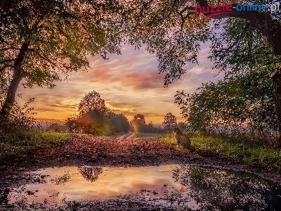 Droga, Kot, Drzewa, Zachód słońca, Kałuża