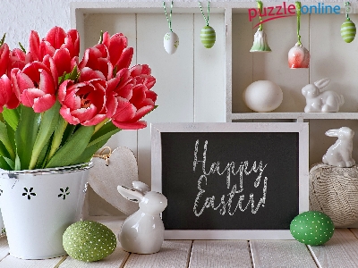 Happy Easter, Pisanki, Kompozycja, Wazon, Wielkanoc, Tablica, Napis, Tulipany, ZajÄ…czki, Zawieszki