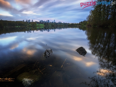 Zarośla, Kanada, Deer Lake Park, Kamienie, Jezioro Deer, Zachód słońca, Odbicie, Burnaby