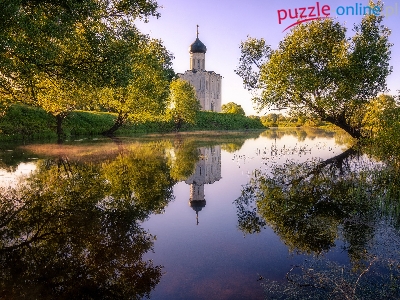 Rzeka Nerl, Okolice Bogolubowa, Rosja, Odbicie, Cerkiew Opieki Matki Bożej, Drzewa, Obwód włodzimierski