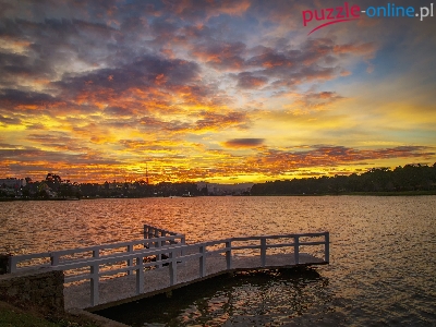 Chmury, Jezioro, Miasto, Pomost, Zachód słońca, Drzewa