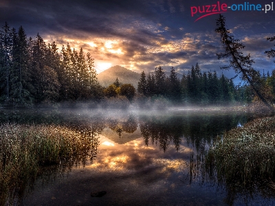 Drzewa, Trawy, Mgła, Niebo, Zachód słońca, Góry, Jezioro, Las, Wieczór