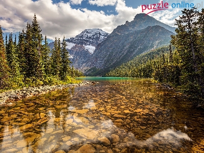 Góra Mount Edith Cavell, Góry, Drzewa, Chmury, Kanada, Kamienie, Park Narodowy Jasper, Rzeka Astoria River, Alberta