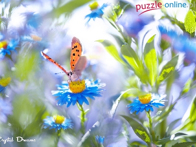 Puzzle Kwiaty, Motyl, Niebieskie, Rozmyte tło