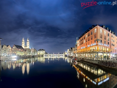 Zurich, Budynki, Szwajcaria, Oświetlone, Rzeka Limmat, Most, Noc