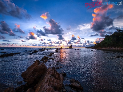 Skały, Indonezja, Chmury, Morze, Wyspa Jawa, Zachód słońca