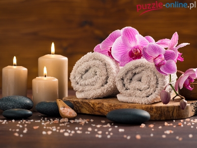 Kamienie, Świece, Miseczka, Łyżka drewniana, Storczyk, Sól morska, SPA, Ręczniki, Kwiat