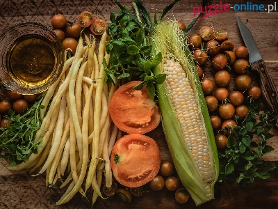 Fasolka, Kukurydza, Szklaneczka, Kolba, Warzywa, Pomidory, Nóż
