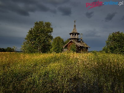Kaplica Piotra i Pawła, Rosja, Wyspa Kiży, Trawa, Wieś Eglowo, Cerkiew, Drzewa, Karelia