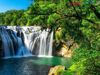 Puzzle Jezioro, Wodospad, Skały, Drzewa