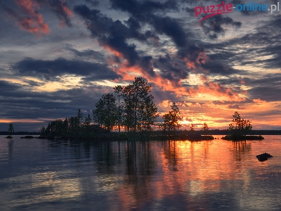 Zachód słońca, Finlandia, Gmina Kuusamo, Chmury, Wysepka, Jezioro Ala-Kitka, Drzewa, Ostrobotnia Północna