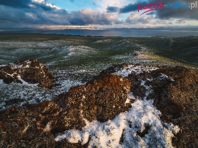 Skały, Śnieg, Morze, Wzgórza, Chmury