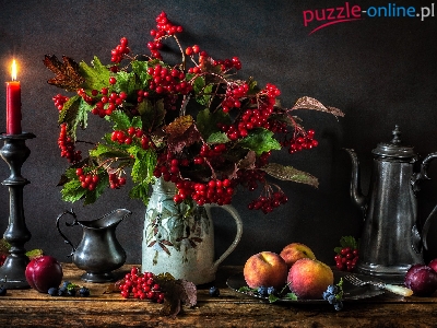 Świeczka, Brzoskwinie, Owoce, Dzbanek, Czerwone, Kompozycja, Kalina koralowa, Liście