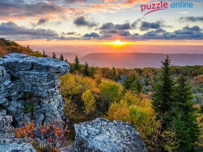 Wschód słońca, Skały, Krzewy, Góry, Jesień, Chmury, Drzewa