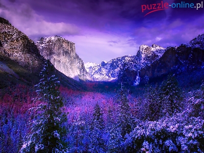 Dolina Yosemite Valley, Park Narodowy Yosemite, Świerki, Las, Stany Zjednoczone, Chmury, Zima, Góry, Stan Kalifornia