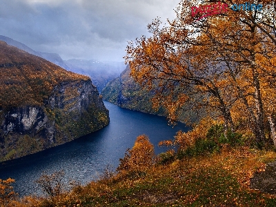 Jesień, Norwegia, Góry, Fiord Geirangerfjorden, Drzewa