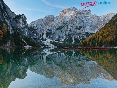 Góry, Włochy, Łodzie, Dolomity, Odbicie, Jezioro Pragser Wildsee, Drzewa, Region Trydent-Górna Adyga