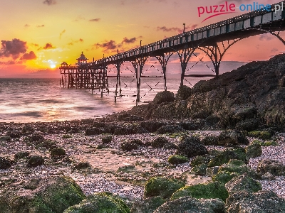 Kamienie, Molo Clevedon Pier, Anglia, Rzeka Severn, Wschód słońca, Clevedon