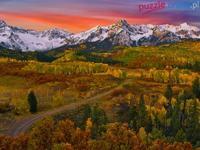 Jesień, San Juan Mountains, Droga, Zachód słońca, Stany Zjednoczone, Drzewa, Góry, Lasy, Kolorado