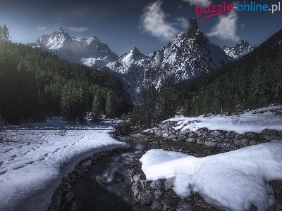 Kamienie, Góry, Drzewa, Zima, Rzeka, Śnieg