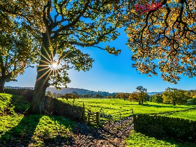Płot, Promienie słońca, Łąka, Droga, Drzewa
