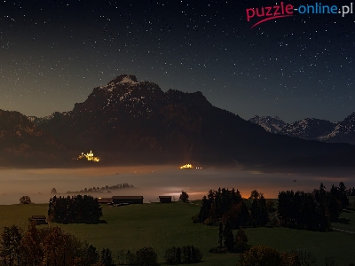 Góry, Drzewa, Jezioro Forggensee, Gwiazdy, Niemcy, Niebo, Schwangau, Zamglone, Noc, Las, Mgła