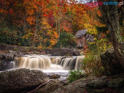 Rzeka, Jesień, Młyn, Kaskada, Kamienie, Drzewa, Skały, Las