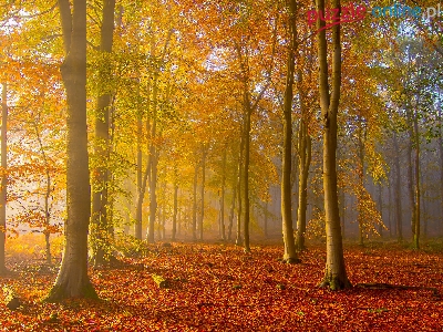 Mgła, Drzewa, Liście, Las, Jesień, Opadłe