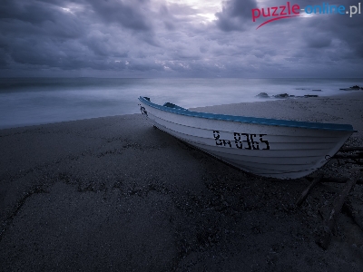 Brzeg, Chmury, Morze, Łódka, Piasek