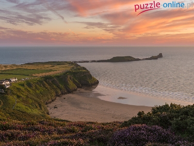 Plaża Rhossili, Morze, Walia, Wybrzeże, Wrzosy, Wioska Pitton