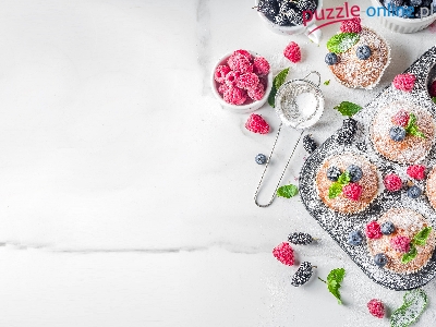 Muffinki, Mięty, Sitko, Maliny, Cukier puder, Babeczki, Jagody, Listki